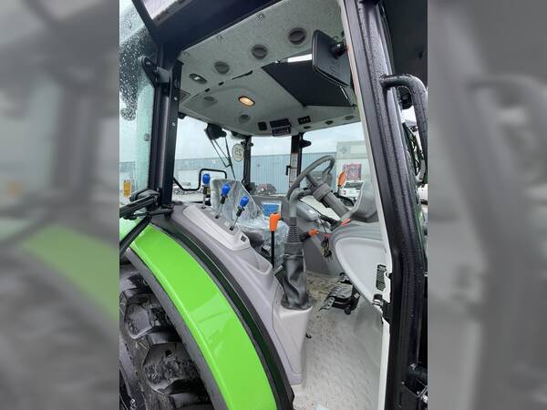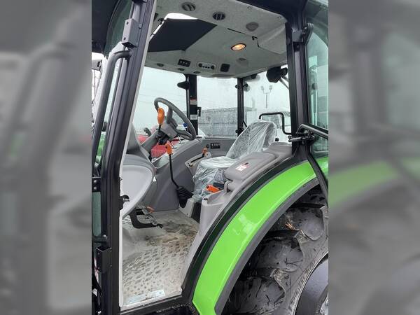 Ergonomic layout with digital/analog dash, adjustable steering, HVAC (heat & air), radio & Bluetooth, high-visibility roof panel for front loader use