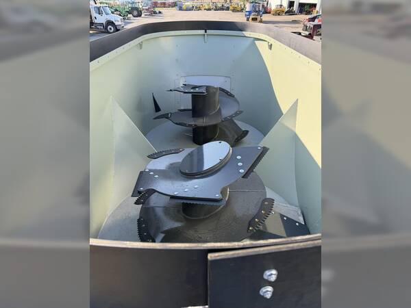 The mixing tub is designed with straight walls and wear-resistant steel to avoid buildup and compaction, supporting efficient mixing and easier cleanout.